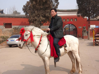 在充滿詩情畫意的寺院門口,我並沒有急著擠進寺院去觀賞景致。卻被兩匹性情溫馴供人拍照的白馬所吸引。經咨詢,每人/次騎馬拍照僅需五元錢,我擔心騎馬會有危險,馬的主人立即向馬發出了“走”“停”等不同指令,我和家人這才大膽的依次騎上小白馬,體驗了一把騎馬馳騁的臆想和未免忐忑的心境:我在想,若在古代,騎馬、坐轎、徒步行走前來拜謁古寺的場景該有多麼的蔚為壯觀!