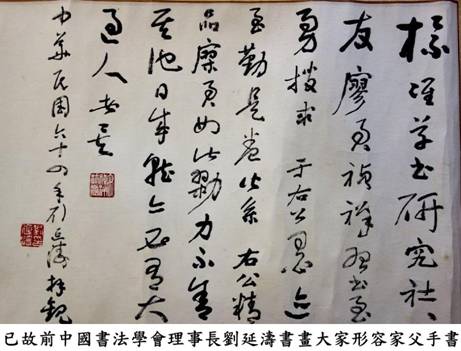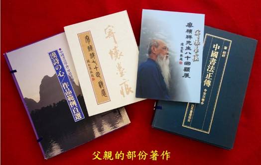 家父曾經發起丶籌組及成立多個台灣書法團體,其中包括「中國書法學會」,並主辦多次中日韓書法交流展等,也曾以「中國書法學會」首席代表身份應邀參加新加坡「中華書學協會」二十週年會慶,與大陸「中國書法家協會」主席啟功做海峽兩岸書法組織代表的首次接觸,對提倡台灣書法風氣及促進國際書法交流有不少貢獻。