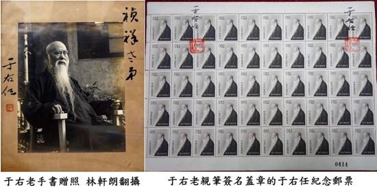 連右老紀念郵票發行,父親都請右老親自在整張的紀念郵票上簽名蓋章,這該是全世界絕無僅有的一張有右老簽字的紀念郵票。