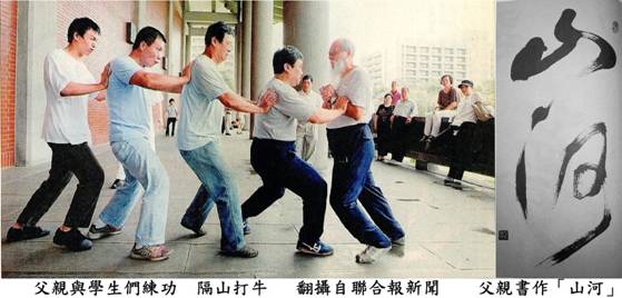 父親一身功夫,平時沉著鬆凈,但發勁時,發人如箭離弦,絶不拖泥帶水。有一年他來美看我們,有習武的老外青年來挑戰,一交手,我還來不及看清楚,他已經被父親甩到停車場去了,躭心有人受傷,嚇得我們不敢再提父親有太極功夫。父親的太極拳學生雖已有「懂勁」「發勁」實力,但至今仍非老父對手。每次回台,常見學生一個個撲上來,再一個個被甩退,或齊上而成炸彈開花狀全體倒退,總是看得我心驚膽跳,但父親的學生們似乎不以為意,繼續努力摸索探究,就像父親當年拜鄭師門下一樣。