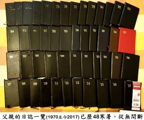 父親用蠅頭小楷每日寫日誌的習慣,歷史更為久遠,我去年回台時,從父親的抽屜裡拿出排列的有條不紊的日誌就有四十八本之多,連今年(2017)的份都已經到位。父親的整理及準備本事,我也是望塵莫及,瞠乎其後。每次出國,他的行李一個月前一定就緒,我則往往到旅遊前夕還在打包。