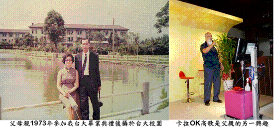 台北有多處卡拉OK店,為喜歡唱歌的老年人提供了自娛娛人的最佳場所,父親是那裡的常客。他中氣十足,聲音洪亮,唱起軍歌來,很有那股雄壯激昂的氣慨。從唱歌也可以看出家父一絲不苟,孜孜不倦的百尺竿頭精神,他不是打發時間隨口唱唱,而是買了歌曲教學卡帶,一字一句,一節一拍,輕重緩急,剛柔強弱的跟著老師學唱,難怪父親每次唱完後,掌聲總是特別響亮!