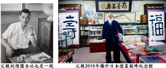 家父的書法根基非常紥實,他通過了日本多個主要書道團體層層關卡的洗禮,由初段開始,打擂台似的,逐步晉升到最頂級的頭銜。父親榮獲日本書道研究溫知會丶書淵會丶日本硬筆書道協會頒予「師範」;正鋒書道會頒予「正傳」;書神會頒予「成家」及「董事」等最高段榮銜。父親因此在日本書道界享有盛譽,頗受尊崇。