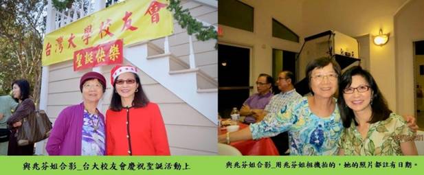 兆芬學姐是2013年我剛加入臺大校友會時最早認識的幾位校友之一,理事開會隔鄰,個性想法接近,又一起編輯年刋,很快就十分投契。我加入北美南加州華人寫作協會就是她介紹推薦的,連當『文苑』雜誌的副總編輯也步她後䴤。