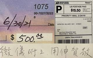 2021.7.1從西岸快遞 捎給風笛的贊助經費美金伍佰元支票厚禮 因值July