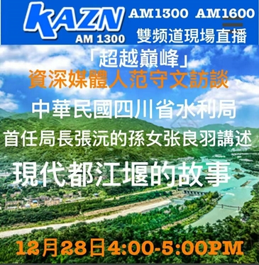 資深媒體訪談詳 超越巔峰直播強 現代都江堰故事 張良羽講述家鄉 四川水利興重建 祖父功勞達表彰 積福榮民存後代 世人永享樂安康 補箋: 12/28/2025 范守文主持《超越巔峰》,中午在1300廣播電台訪問張良羽文友。時間緊湊下兩位合作無間,談吐自如。而且良羽更講述著她家族歷史有關治水工程知識,及個人的經歷中……趣味盈然令到聴衆能感懷至深,如沐春風,並無冷場,實屬不容錯過的電台直播節目呢。