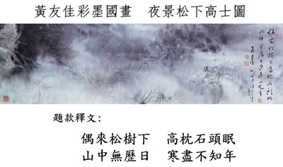 書法練成楷隸篆 畫分彩墨鳥花篇 精心著作山川秀 美意佳章草木姸 譽載名揚傳海宇 滿懷激電動南天1 藝廊標草盤龍走2 壇設情深至敬虔3 註: 1 黃友佳書畫家屬電機工程師,而且兼有書法繪畫造詣頗深,故具備科技與人文之內涵。 2 唐朝書法家釋懷素和尚在(自敘帖)中有句「筆下唯看激電流,字成只畏盤龍走」形容狂草字形和下筆,有如電般迅疾之意。 3 因曾獲多位同為喜愛書畫藝術的師長,及學友們贊助催生下,故設立成「博理藝廊」而畫展在此地舉辦。實相得益彰,更有意義呢。