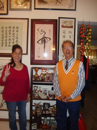 1 ,2 是陸正平笛兄倒書字句。 我和陸翁合攝照中的「一筆倒舞」書法,屬他老人家於2006年獲得特殊傑出人才定居美國時書贈我存念。此幅書法是從腳尖起筆,由下而上一筆呵成。曾在2001年廣東省第二屆記者節書畫攝影大展上榮獲書法一等獎,10月獲得廣東省版權局頒發專利登記証書。