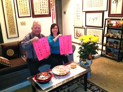 寄語致謝招迺英笛兄饋贈:「老蛇辭歲萬家福,天馬騰送四季財」及「戶戶快樂出外,人人平安回家」書寫揮春対聯。