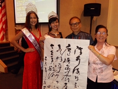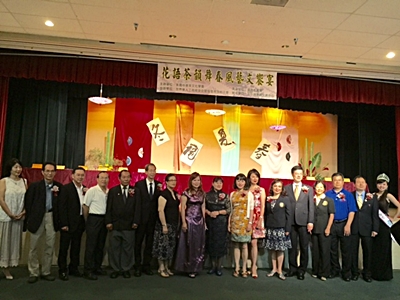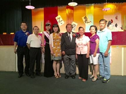 左起:伍尚齊(中華會館主席)、馬玉強詩人、台灣小姐、 蘇王秀蘭(合桃市副市長)、梁永泰(僑務委員)、梁柳英(風笛公關)、 鍾錦雄王玉霞伉儷(風笛古詩詞編輯超逸姐夫及姐姐)