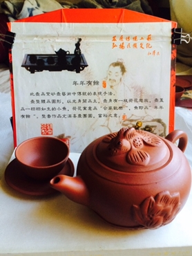 周才軍技藝超群 領悟紫砂氣韻文 創作思維由好學 天聰資質更慇勤 開壼實用憑知識 溫水除汚屬見聞 品茗茶香能養性 冰心一片表歡欣 補註: 承蒙友人餽贈其作品(年年有餘)一套。並曾和作者合攝存念。
