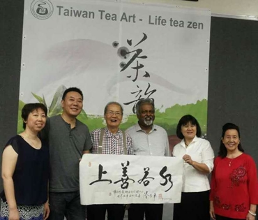 中華茶道久名傳 陸羽當年結雅緣 掛畫插花堪賞覽 焚香韻味樂參禪 照片說明: 國際華奇會主要成員參加合攝存念。 左起:甘碧霞公關部長、薛浩虎理事長、陸正平會長、魯三美Sam My秘書長、中華茶文化會楊綺真會長、梁柳英執行顧問兼風笛零疆界詩社公關。