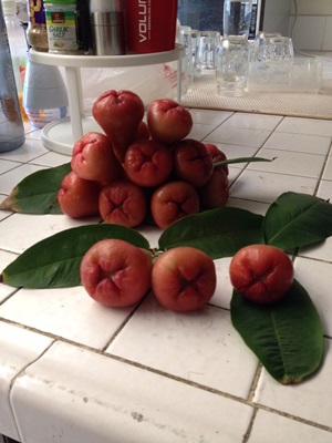 颯颯金風歲序移 欣逢蓮霧展芳姿 果皮紅白憑挑選 品種繁多種植宜 營養衡量存價值 清甜肉質衆人思 釘鐺懸掛高枝上 正值秋涼採摘時 補箋: 附圖:蓮霧,屬日前在三弟梁漢棋 (Henry) 家內,亦是祖屋後園中的果樹所採擷而攝下。 蓮霧(Wax Apple) 別名:洋蒲桃。形狀似鈴亦稱釘鐺果,粉紅色種俗稱南洋種,又謂黑珍珠。目前臺灣栽培最多,屬最具經濟價值的栽培品種之一。泰國種植的稱紅寶石(Thub Thim Chan) 似飛彈,子彈形是大果種。果皮深紅色至暗紅色。產期自6月至10月。