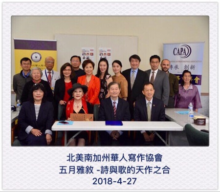 南加盛會集群英 悼念先賢聚合情 節目編排精彩誌 藝壇展現樂聲鳴 周年慶典源流遠 文學傳承萬里程 海外華人同致力 弘揚國粹共崢嶸 箋註: 2018年南加作協和美西華人學會5月5日(拜六)2:PM- 4:30PM,在洛杉磯華僑文教服務中心新會議室,場面盛大,隆重聯合舉辦《詩與歌的天作之合》。節目豐富包含粤語(廣東話)吳語朗誦古詩詞、現代詩,京劇詮釋中國詩詞、書畫、歌唱、舞蹈、吉他、揚琴樂器彈奏等等…有著高級娛樂性觀感及重大的價值紀念意義。