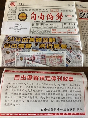 近日閱讀自由僑聲郵遞月報,得悉有關停刋啓事為之惋惜感嘆。因它不但屬日常生活中,所給于我18年來的一份重要補充精神上糧食,更存留下難以忘懷的追憶。 記取1980年定居美國南加州橙縣,自從生命的轉變,重獲新生成為基督徒後。在華人浸信會積極參加各項事奉,傳揚福音並實行文字工作。為香港𡿨女光〉季刋義務撰寫了二年多生活見証文稿,除了上班工作外,同時定期到羅省晚芳詩社詩詞月會,及粥會聯誼擔任國際華奇會會務、中華兩岸文藝協會執行顧問、世界華人作家交流協會會員、北美南加州華人寫作協會理事、風笛零疆界詩社公関。 由於興趣使然從事文化境域,堅定心志執筆寫作賦詩期間令我最感到欣慰。在2004那年,美國越南知用校友會負責特刊時,我寫下:永懷良師吳釗漢先生。文章登載於自由僑聲新春特刋(歲次甲申)屬已故李文慶先生做總編輯。當年正值台北一0一大樓購物中心開幕。他以小丁筆名的一篇:叫我世界第一高。而內容曾提到越南歸僑老報人農立邦先生(江志遠同事農金濤父親)文才橫溢的應景詩云: 台北一0一, 舉手摘星辰。 不敢高聲語,怕驚天上人。