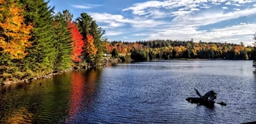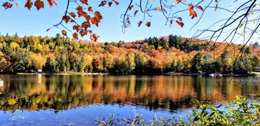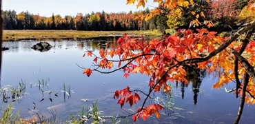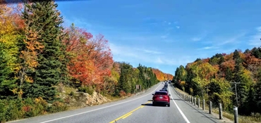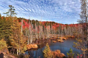 楓紅一片接藍天 極目穹蒼萬仭連 雲淡風輕迎旭日 陽光普照有清泉