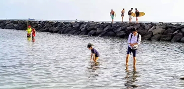 碧海堤邊豁眼眸 弄潮早起逐清流 摒除苦惱心舒暢 喚友攜兒共樂酬