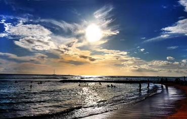 夕陽西下散豪光 倒影椰林水面張 天際浮雲舒捲意 風光如畫悅心房