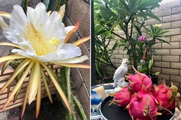 火龍果(Dragon Fruit)又稱黃龍果, Pitaya果肉分有紅,白,黃色。外形屬黃色的口感像燕窩味道,營養成分豐富種植較難,故售價昂貴。我後院栽種歷時已多年,近日竟然有成果深表高興呢!