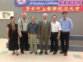 藝苑羣英集合中。週年慶典挹春風。 南加寫作長青會,牆壁書詩畫意濃。 同聚首,樂融融。新詞興譜遣懷衷。 嘉賓滿座談今古,五四題材主見同。