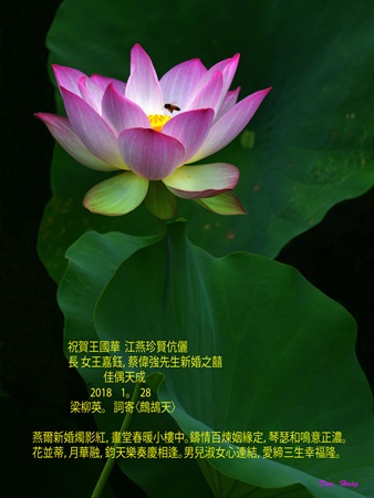 花並蒂,月華融,鈞天樂奏慶相逢。男兒淑女心連結,愛締三生幸福隆。