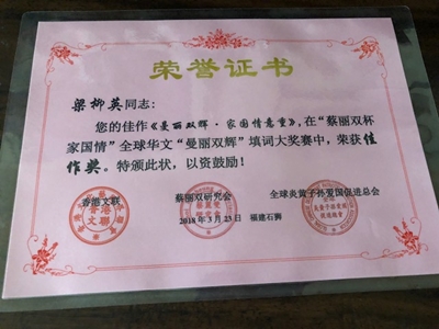 補箋:參選蔡麗雙杯家國情,全球華文《曼麗雙輝》填詞大獎賽,並榮獲佳作獎。此屬蔡麗雙博士所自創詞牌,和曾制定詞譜的《清麗雙臻》可稱為:相得益彰,猶如詞壇的一對嬌美的並蒂蓮,當代格律詩詞高原的兩座奇峰。