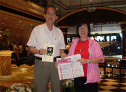 6月6日時值中午呂嘉肇(思佳)和盧耀東(甘草)與我在帝京軒酒樓見面,我們以文會友,因網結誼,天南地北,暢所欲言,款款而談,呂嘉肇(思佳)是經遠居法國前屬越南知用薜楚明先生與我至今仍緣慳一面的學長,曾介紹他有賀我出書並安排有幸能見面認識到這位為人謙厚、坦率、真誠友人。他是老撾寮國華僑人香港僑友網骨幹,是老撾華僑華人香港聯誼會副會長兼秘書長,(該會不屬僑友網) 。送出成立五周年印刷精美特刊,及二本越南南僑中學校友會刊物內容豐富,更題贈詩句: