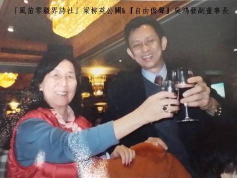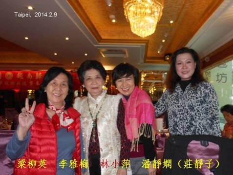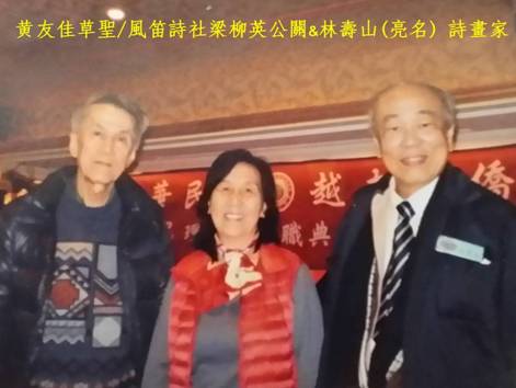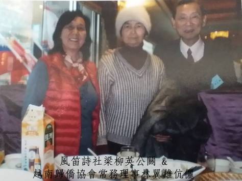 Lonely American) ,她簽了名送給我得以閱讀。大家因有共同志趣嗜好故交談甚歡。我請她上網觀賞風笛網站,值此贈她『風笛雅集』存念。並有見到曾經投寄風笛稿件的莊靜子(潘靜嫻)女士④,亦給了她越柬寮週報。 Taipei, 2014.2.9照片說明: ①潘明太太林蕙芳女士梁柳英公關/越南歸僑協會黎愛珍理事/林小萍女史 ②『自由僑聲』李雅梅理事家人(1)(2)(4)/風笛梁柳英公關(3)& 林小萍女史(5) ③林小萍Vera女史&梁柳英公關贈書交流 ④梁柳英/李雅梅/林小萍/潘靜嫻(莊靜子) ⑤黄友佳草聖/風笛梁柳英公關& 林壽山(亮名) 詩畫家 ⑥風笛梁柳英公關&越南歸僑協會常務理事林翼雄伉儷 ⑦潘明太太林蕙芳女士&風笛詩社梁柳英公關 ⑧「風笛詩社」梁柳英公關&『自由僑聲』吳鴻發副董事長