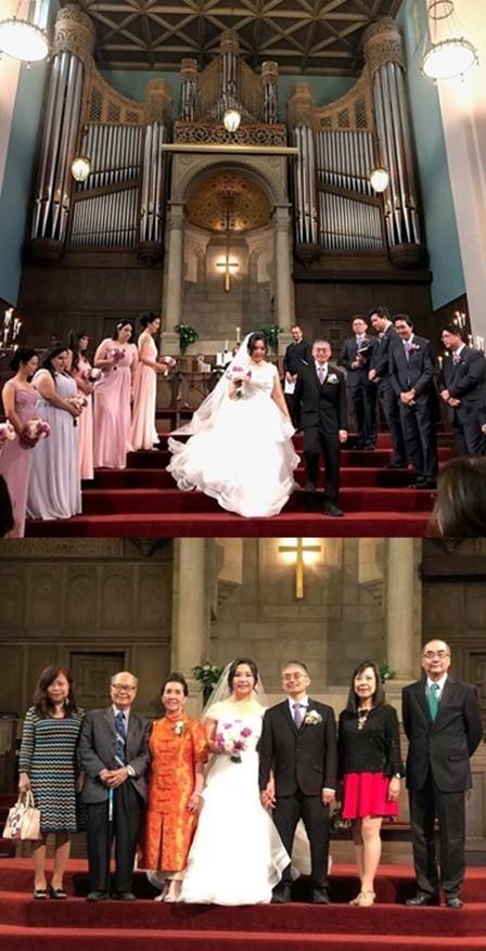自左: 游萊丹 97高齡游芳憫教授 梁柳英 新娘新郎 游蓬丹 畢日陞