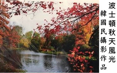 攝影展覽作品中,《波士頓秋天風光》好友林達美感領到其中竟然藴藏着:金木水火土五行。覺得特別有意思,當場買下請我贈句紀念。因她屬虔誠禮佛。我便為之依景題下: