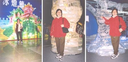 展示特色包括有: 世界之首◆世界首個商場擧行冰燈展覽. 國際盛事◆哈爾濱冰雪節,被譽為世界四大冰雪節之一,而冰燈藝術更是哈爾濱獨有文化. 國家級數◆負責是次設計及製作之冰雕師, 亦是籌辧 哈爾濱 冰雪節成員之一. 並曾於世界獲奬無數, 其參與作品曾邀得國家領導人 胡錦濤 , 江澤民 及 朱鎔基 等出席觀賞. 全港最凍◆展場氣温維持 – 5 度 C . 相對室外三十多度的炎炎夏日, 肯定是個夏天全港最冰凍的地方, 有如一個巨型雪櫃空降 太古 城中心. 展品多樣◆16 組各具特色的冰燈逾八成展品, 更是首次曝光, 既有最具氣勢的中國建築物, 亦有帶來歡樂的極長冰滑梯, 各適其適. 陣容龐大◆集 22 位頂級冰燈師, 連續 20 日, 毎天 24 小時匠心獨運之作. 並創造出 16 項冰屋之最. 1. 最神秘 : 冰隧道. 2. 最傳奇 : 西廂記人物, 園林景觀. 3. 最令中國人期待 : 2OO8 年北京奧運五環及火炬. 4. 最令中國人驕慠 : 神舟六號. 5. 最有趣 : 冰雪橇. 6. 最終極体驗 : 冰屋. 7. 最玲瓏浮凸 : 彩龍浮雕. 8. 最具氣勢 : 高 4.5 米濶 12 米紫禁城. 9. 最奪目 : 八角冰塔. 10. 最具香港代表性 : 冰紫荊. 11. 最巧奪天工 : 大型花蕉 (中國傳統的宮廷器皿). 12 -- 15. 最栩栩如生 : 中國吉祥浮雕. (龍鳳呈祥, 龍馬精神, 双鳳朝陽及松鶴延年) 16. 最刺激 : 冰滑梯. 特將照片陳列刋登, 但願衆人觀賞精品傑作之餘, 都能分享到當時我為拍攝這些珍貴鏡頭而捕捉領受着那份透心寒涼的感覺呢? 寫於2OO6 年八月廿五日