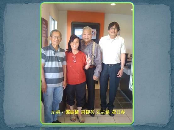 攝於 江志遠 梁柳英詩家伉儷下榻 旅館 左起:鄧振權 梁柳英 江志遠 黃日春