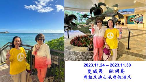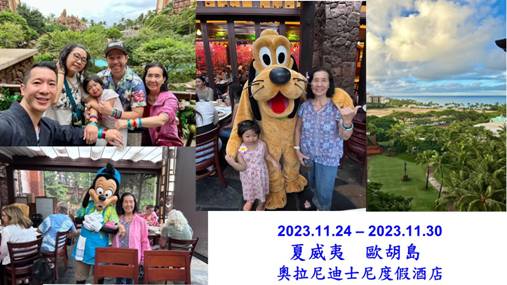 夏威夷群島位於太平洋海中,美麗群島。擁有宜人氣候,獨特文化,風景壯麗。有著豐富的自然海灘人文景觀。更屬於全年都是好時節旅遊勝地。 2023.11.24年感恩節期間,我和女兒江麗芬Helen,兒子江嘉豪Terry,江嘉偉David帶著三歲半外孫女安兒Nora,中午在南加州搭機傍晚抵達夏威夷入住Waikki-Sheraton酒店。 翌日清晨早餐後,當地文友王育梅DollyWang攜同著名土產咖啡和黑朱古力腰果餽贈,相聚非常欣慰。我倆本約定到臺北會面,卻因重陽節當天氣候酷熱,我在玫瑰山崗慎終追遠掃墓時中暑,暈倒跌傷不能成行,要取消了機票引以為憾。現竟能見面倍感珍惜,當話別時卻添了小插曲。她發覺手提電話失落了,所幸有人將之交給酒店內一間餐廳幫保管著,即往领回呢!此地民風純樸路不拾遺美德,值得表揚呢。 11/26 當遷往住在Marriott Molina酒店。房間寬闊有著舒適感覺,附近環境店鋪林立,街道很熱鬧人潮擁擠下,顯出了景物泰然。我們到各處瀏覽,欣賞大好風光漫步到來海灘,欣賞黃昏日落又另有一番享受。清早時刻大家共浴泳池,更樂趣無窮…… 11/27 中午 我們抵臨奧拉尼Aulani 迪士尼度假酒店,揀選了半海景房間非常愜意,而且當居高臨下,四周的景物可一目了然,同時這裡有著公認屬最好親子酒店盛譽之稱。此處遊樂項目有著豐富特色活動,每天提供特別的迪士尼人物Mickey、Goofy,陪同早餐,簽字存念。 每星期中一晚,夜色低垂在草坪有歌舞表演娛樂節目,與衆同歡,內部的大小五個泳池,另有形形色色的水上運動設備令你能得以盡興……。 11/30 中午十二時,我們離開這個無限快樂園地,搭機一切順利回到L A家中。感謝神!賜恩福看顧保守下天倫共聚,同度難能可貴的陽光、海灘浪漫旅遊。情牽夏威夷旅遊,回味無窮而題下詩句: 感 懷 (暨贈: 王育梅Dolly Wang摯愛文友)