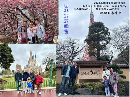 二○二四年三月十八日,我和女兒江麗芬Helen江嘉豪Terry江嘉偉David,帶著外孫女Nora安兒搭乘Delta 中午班機由南加州傍晚抵臨日本東京。入住喜來登Sheraton 酒店後,由於爭取旅遊行程,安排時間緊湊下參加了Tokyo Disneyland 和Disney Sea,觀賞內部各項特技新奇的節目表演及設計華麗壯觀遊行……實令人嘆為觀止。 由於天氣轉變寒冷難以莫測,毅然決定取消三天到大阪Osaka遊行,留在東京各地遊覽。由於日元貶值點燃了全球各地旅客赴日購物熱情同時也直接將旅遊熱度拉滿,成為觀光重要客源市場呢! 東京是日本的首都,也是最繁華的旅遊城市。新宿擁有著名的迪士尼樂園,更屬於可滿足各種風格所喜愛的購物天堂。繁榮地區豐富的文化遺產和無數的美食選擇;漫步在銀座感受到都市繁華熱鬧外,更往東京市內景觀晴空塔,同時在Tokyo Shiba, Toufuya Ukraine 餐館內,慶祝安兒四歲生日中。參觀淺草寺,聞名景點皇室等歷史地段,領略到日本文化風俗呢。 三月廿四日當造訪集結於車站地下層,有名拉麵街。品嚐著飄散舊日情懷拉麵有著另一番感受。 三月卅一當天在期待盼候下竟然能不負所行,終於在離開前能有機會欣賞到櫻花盛開景象。感謝神賜恩福能如願以償下給於我們共度這段歡樂美好時光。 四月二日晩上平安返回美國家園。並且專此誌記下留了難忘記憶,愉快的旅遊呢!