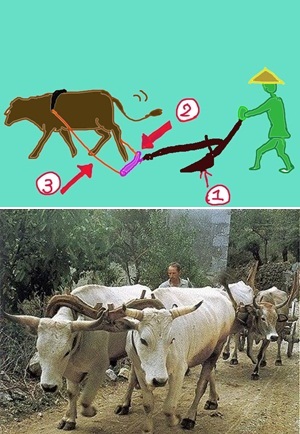 荷軛開荒土 勤耕步勁沉 應知憐舐犢 毋負老牛心