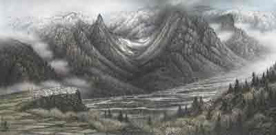 從2000年7月去青海長江源頭沱沱河寫生體驗大自然,到2005年10月最後一筆,《長江萬里圖》創作,在不知不覺中消磨了自己五個寒暑。我已記不清有多少個起早摸黑奔波在荒涼的高山、雪域、江邊岩前。十多回的漂泊寫生一頁頁填滿了寫生夾的同時,臉上也記載了歲月的痕跡。日出日落,成了漫漫寫生路途的同伴,星星明月不時與內心私語,高山流水相送相別,五彩雲霞給肮髒的衣服塗抹彩虹。旅途中有多少個不眠之夜,心中流淌著長江水,又有多少個夢遊崢嶸峻嶺,有時無奈地在狹小的畫室,靜看這長長的畫紙無從落手……,又有多少個夜深人靜,思念遠在紐約的父母和他們蒼蒼的白髮。兩千個日日夜夜,寫滿的是對光陰的感慨,還不時蕩起青春歌謠的餘音,彙集在滔滔的長江水中,流向東方,流向大海,成為記憶。