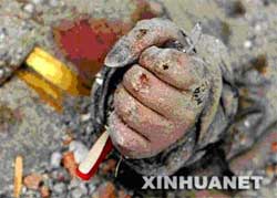 一名死難學生手裡緊緊攥著一支筆。(圖提供:新華網)