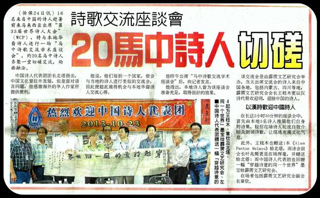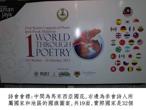 2013年10月20日至26日,第33屆世界詩人大會在馬來西亞霹靂州召開,來自馬來西亞、中國、臺灣、印尼、法國、西班牙、荷蘭、德國、美國、日本、韓國、墨西哥、哥倫比亞、巴拿馬、阿根廷、捷克、新加坡和摩洛哥等32個國家和地區的詩人和作家約250人(其中馬來西亞詩人近100名)歡聚一堂,以詩會友,實為全球詩歌界一大盛事。本屆大會主題為“穿越詩意的同一個世界”。