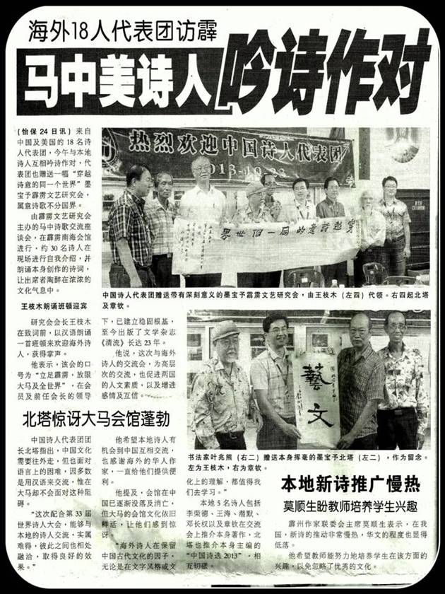 23日下午,在怡保市古色古香、中國文化氛圍濃郁的南海會館,中國詩歌代表團和霹靂州文藝研究會聯合舉行了中馬兩國詩歌交流學術對話會,為中、馬兩國文化交流寫下了重要一頁。馬來西亞著名詩人吳岸和王濤、霹靂州文藝研究會會長王枝木、副會長章欽等參加了交流會。接近尾聲時,雙方交換了禮物,其中包括詩人書法家王桂林的墨寶。北塔參與主持了此次馬、中詩歌學術交流會。