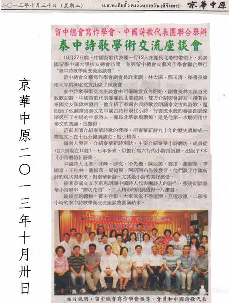 2013年10月29日晚,第33屆世界詩人大會中國詩歌代表團大部分成員在曼谷考察途中,與泰中文化人聯合會舉行了茶話會,中國詩歌代表團成員與泰中文化人聯合會成員近20人參加了活動。