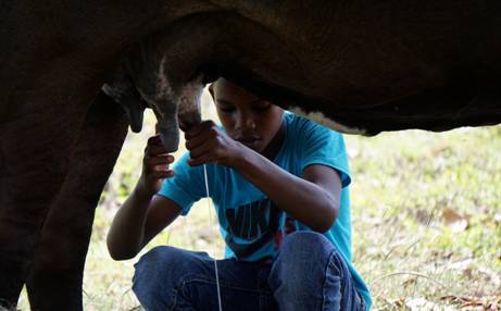 圖片說明:安笛•費南德斯每天中午放學回家都到池塘邊草地上擠牛奶。