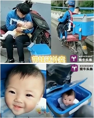 出生僅六個月的霏兒坐在爸爸李園園的外賣箱裡跟著送外賣, 李園園早上先將女兒帶在身邊照顧,中午再將女兒交給在市場工作的老婆。(取材自紫牛新聞)