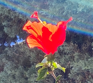 2021 年感恩節屋後早上晨光映照下的大紅花神火消災解難, 正如舊約聖經摩西崇拜上帝之火花樹The Burning Bush of The Bible Old Testament with Moses — 祝大家好運多福!胡師母評說: “大自然的油畫,還加上彩虹!”