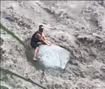 四川彭州龍門山鎮的大洪水,一對父子受困岩石上,兩人最後被洪水沖走。父親獲救、兒子罹難。(取材自齊魯晚報)