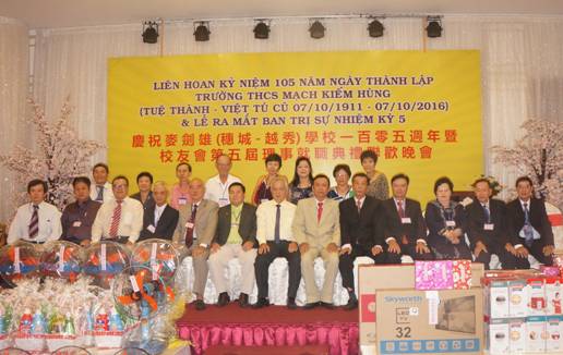今年(2016)10月7日是百年名校麥劍雄(穗城—越秀)建校105週年紀念,暨第五屆執委會理事會就職,是日假座胡志明市第五郡皇潮宴會酒樓舉行就職典禮與聯歡宴,筵開七十一席,場面氣氛熱鬧。各屆校友(包括聞訊從外國回來參與的校友)濟濟一堂歡聚情誼,各校友藉此機緣久別重逢,歡騰之情筆墨難以形容,為美好的人生留下一個亮麗的烙印。