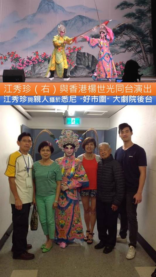 上世紀八十年代,曾是本市“統一粵劇團”花旦的江秀儀(江秀珍),1987年告別劇團移居台北。1990年在澳洲悉尼參加親友的一個宴會中,邂逅了她的丈夫歐陽先生(出生於胡志明市),千里姻緣情投意合共結連理,1991年隨夫定居悉尼市。雖生活於海外,但仍情繫故土,所以曾五度回越。現受職於悉尼市郵政局,工作雖然繁忙,可忙中抽暇到曲藝社與同好們交流曲藝,並到老人院為老人家唱曲以娛長者情懷,與長者們共渡歡樂時光。