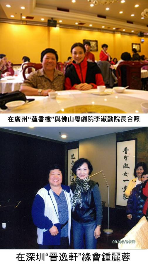 最近,值到中國深圳及香港旅遊,在機緣巧合下,筆者在深圳晉逸軒酒家的練曲室緣會鍾麗蓉。當年她在本市粉墨登台,筆者有緣與之相見,雖然時間流逝相隔多年。見她風采依然,令人驚嘆藝術界中人駐顏有術!