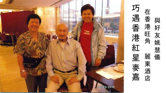 喜歡看香港粵語電影的觀眾,相信也很熟悉喜劇演員麥嘉了,他的“招牌”光頭、諧趣的演出、喜感特濃的語音,總令人忍俊不禁,捧腹大笑,堪稱開心果!近年來他已退居幕後,所謂演而優則導。當日,他正在旺角界限街麗東酒店的餐廳,接受香港某雜誌社的專訪。筆者恰巧在此,有緣巧遇,筆者即上前同他打招呼,聊了幾句,麥嘉還應要求拍了張照片。交談中,麥嘉對越南華人竟能說一口流利純正的廣東話感到意外,筆者反而被他訪問起來,便將越南的風土人情大略向他介紹一番;包括越南經濟突飛猛進、政治安定、社會和諧、胡志明市第五郡華人普遍說廣東話等等,是一個旅遊的好地方,歡迎他到訪。