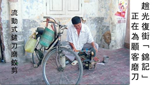 「鏟……刀,磨鉸剪」,一聲聲長短有韻的叫喊聲,卅年前常迴蕩在本市華人同胞聚居區內,四十歲以上的中年人,對這一聲叫喊並不會感到陌生。這種沿街兜生意的粗活,最盛行是在四十年之前的年代,這是一種流動工藝服務業,有些是步行兜生意;有些是騎著一部殘舊的單車,攜帶著極簡陋的工具。就這樣穿街過巷,沿途喊叫。操此業者多是勞苦民眾,他們住在昔日的勞動街區如:第八郡森舉區、第六郡茅寮區、第五郡菜園區、羊咩山區和第十一郡的羅笑區、織蘿區、中山門區、穗義祠區等,這些區域現在早已改頭換臉,生活情況已大幅度地改善,有的已成為富裕區,所謂十年河東十年河西!