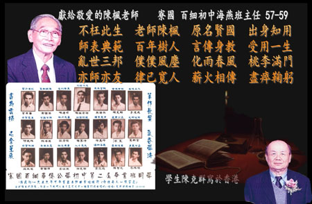 陳老師因是我們在少年時期茁壯成長過程中最關鍵的老師,接觸時間最長最多,也對我們的幼苗思想行為影響最大,他為人正派負責,但掩飾不住對我們學生們的親切與關懷,有事沒事見到他時,我們心中都有一絲絲的暖意,我特別記得他在站著講課時,間中左右手肘在腰上挾一挾的獨特習慣!他是我們心目中最敬愛的老師,只是我們中國人對情感的表達,一般都較為含蓄 (唉! 有時是含蓄了一世人,好辛苦!),不如在外國的鬼佬鬼妹見面時都熱情的擁抱與KISS一番,借一塊錢則要寫張IOU借據,請吃飯還要 “帶塊肉”到你家中的那種!特別是內向的我,真希望在我們進入老年的時候,多些關懷這幾位教導我們向善,積極面對人生但現在生活條件卻很一般與不及我們的好老師們!